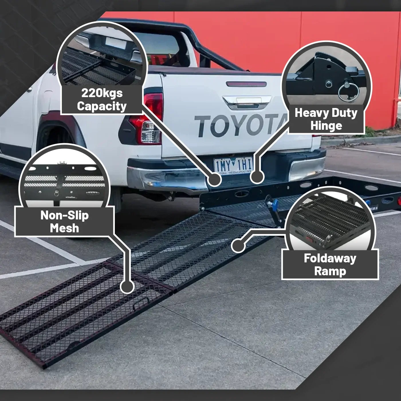 The carrier features an integrated 2 section ramp which folds up and out into 3 different positions.
