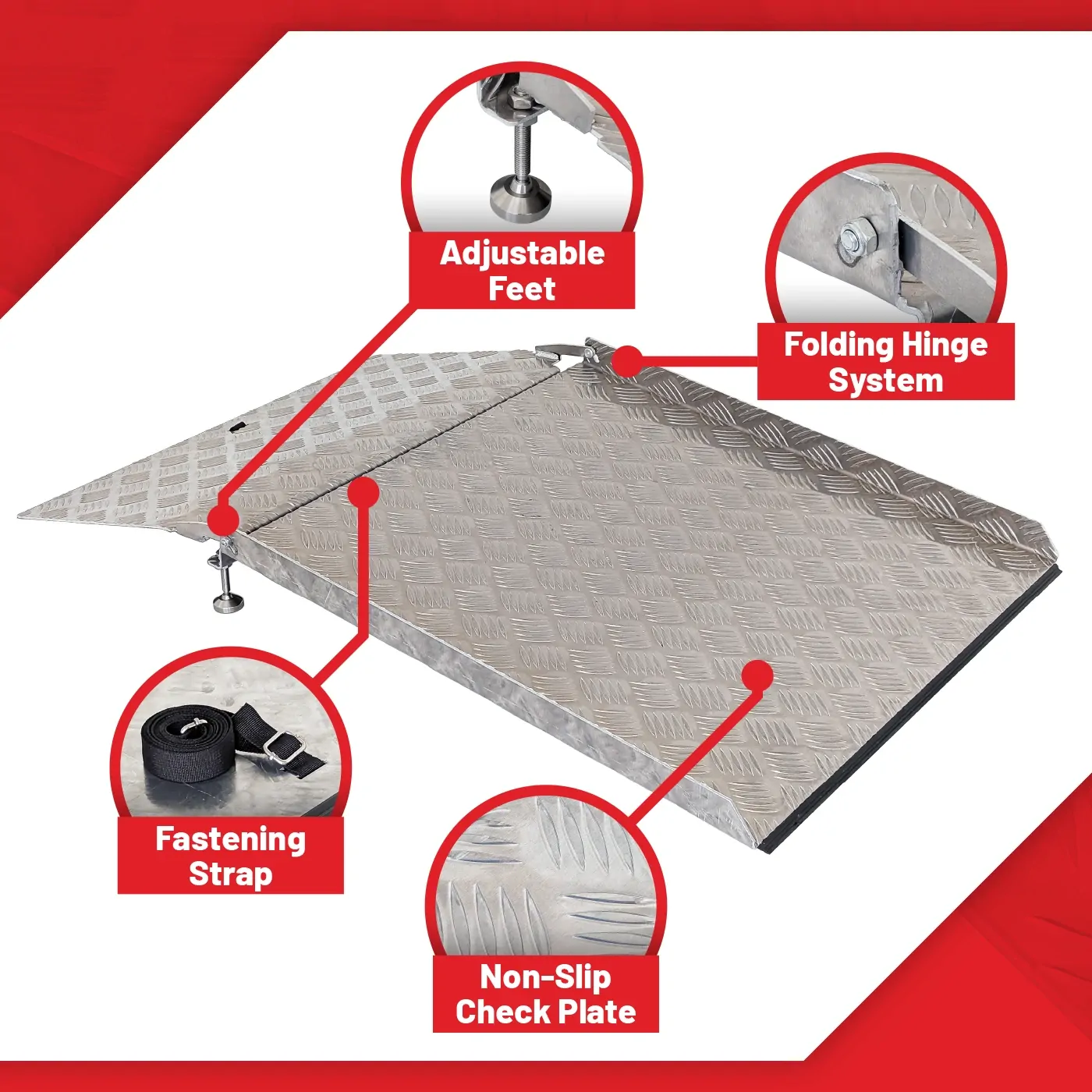 The ramp is hinged allowing the larger section to be adjusted to the threshold height with the second section then lowered allowing a smooth transition over the kerb etc